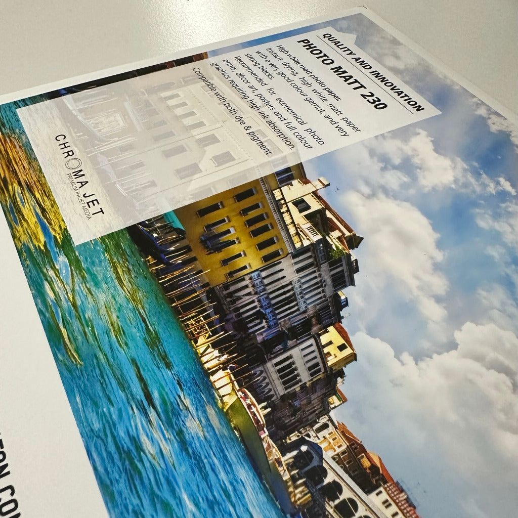 Chromajet Photo Matt 230 Photo Paper is a premium high white matt photo paper, ideal for both economical photo prints and creative inkjet projects like calendars, portraits, and art printing. Designed for superior photorealistic printouts, it's versatile enough for decor art, posters, and full-colour graphics.