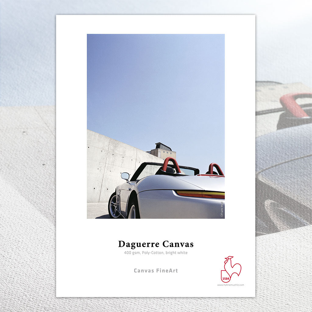 Hahnemühle Daguerre Canvas 400 gsm is a bright white, poly-cotton canvas with a matte finish and fine texture. Its heavyweight base provides strength and durability, making it ideal for photo reproductions, fine art, and gallery wraps that need crisp detail and long-term stability.