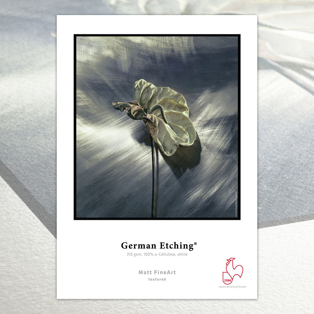 Hahnemühle German Etching 310 is a mould-made fine art inkjet paper with a distinct textured surface. Its velvety tactile feel and heavyweight base make it ideal for reproducing artwork, etchings, and fine art photographs with depth and richness.