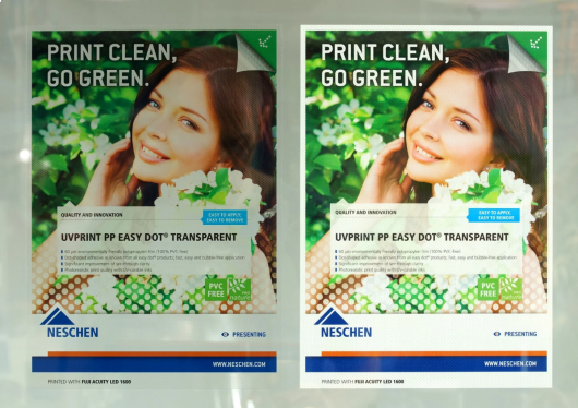 The innovative dot adhesive allows a bubble-free application, even for untrained individuals, and residue-free removal – ideal for short-term promotional campaigns at the point of sale. This member of the Easy Dot family offers photorealistic printing results and is optimised for UV-curable inks, UV-gel, and screen printing.